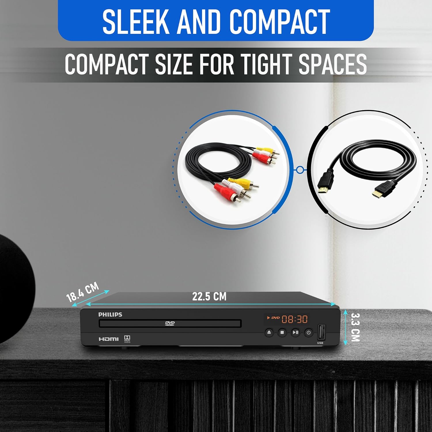 Philips CD Players for TV with HDMI Port 1080P All Region HD DVD Player for Smart TV USB Input Remote Control Device, Mini DVD CD Player for Home Stereo System, HDMI and RCA Cable Included